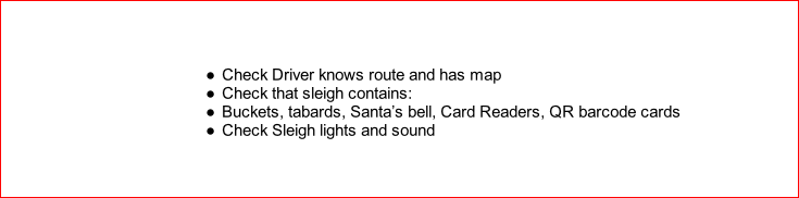 - If there is a danger of the sleigh having to speed up (beyond walking pace) to go to next road, etc., Santa MUST get off the sleigh and walk to next point.